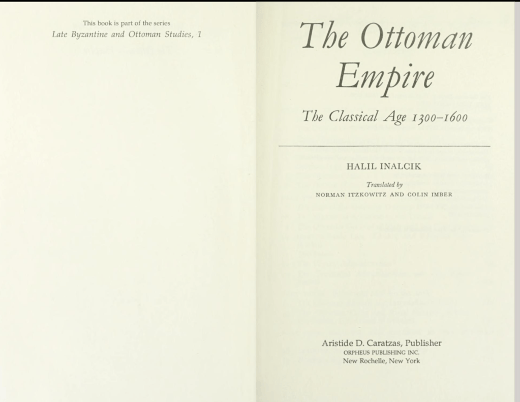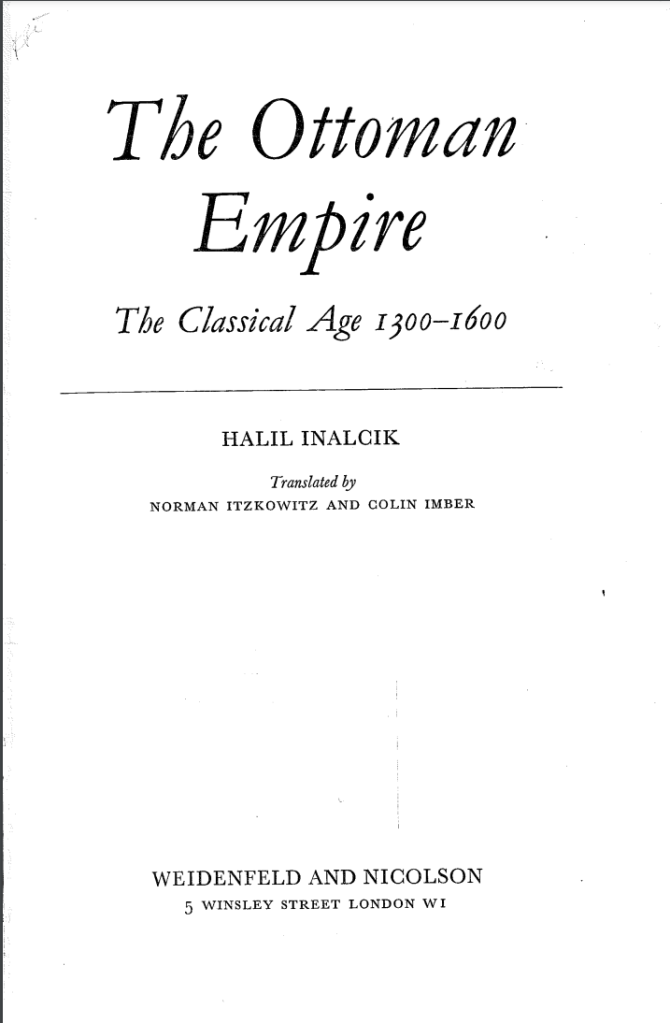 The Ottoman Empire; The Classical Age, 1300-1600 (History of civilisation), by Halil İnalcık translated by N. Itzkowıtz and C. Imber, Weidenfeld and Nicholson, London,1973 (1.Baskı)