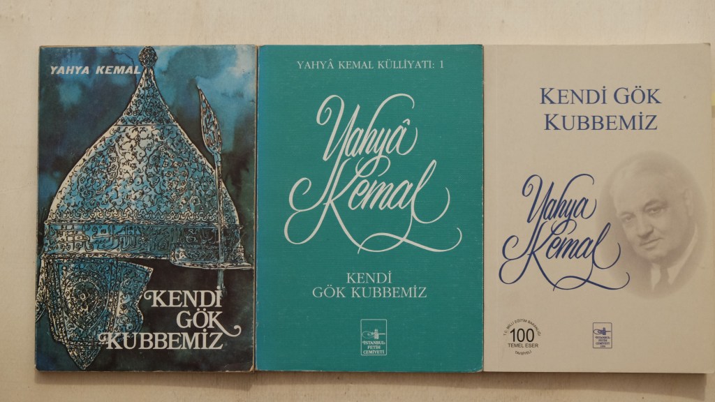 Yahya Kemal Külliyatı’nın 1961’de yayınlanan ilk kitabı Kendi Gök Kubbemiz ve 1974’te yayınlanan dokuzuncu kitabı Çocukluğum, Gençliğim, Siyasi ve Edebi Hatıralarım‘da aynı kapak tasarımı kullanılmış. Bana kalırsa, o yılların kitap kapaklarına göre epey klas, soyut ve eskimeyen bu tasarım da biraz şairin işi ya da O’nun müdahalesiyle şekillenmiş. Tamamen spekülatif bu iddia için üç dayanağım var. Birincisi, Abdülhak Şinasi’nin aktardığı, şairin kitaplarında kullanılacak kağıtların niteliğine kadar titizlik göstermiş olduğu bilgisi. Böyle bir dikkatin kitap kapağı işini yayıncıya bırakacağını sanmam. İkincisi, mezkur tasarımın İstanbul Fetih Cemiyeti’nin izlediği yayın politikasına pek de uymayışı. Bunu kitap kapaklarının zamanla aldığı hale bakarak söylüyorum. Üçüncüyü de sırası gelince yazacağım.
