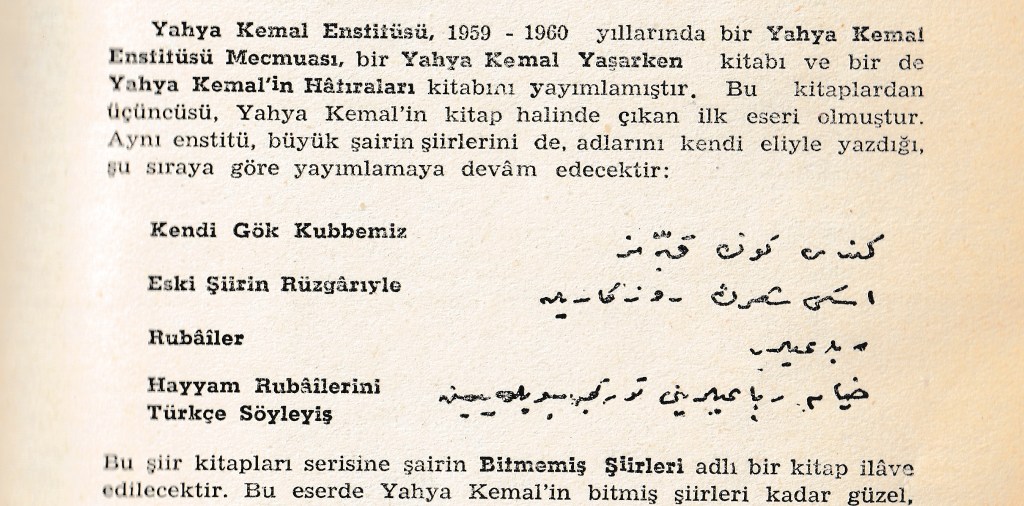 Yahya Kemal Külliyatı 65 senedir İstanbul Fetih Cemiyeti tarafından yayınlanıyor. Külliyat’ın İlk kitabı Kendi Gök Kubbemiz‘den sonra 1962’de Eski Şiirin Rüzgarıyle, 1963’te Rubailer ( ve Hayyam Rubailerini Türkçe Söyleyiş) yayınlanmış. Yeni baskılarda adı geçmese de, Nihad Sami Banarlı külliyatı yayına hazırlamış. İlk baskılarda yer alan bir yazısı var Banarlı’nın.-5. baskıda var, 10.baskıda yok-. Kitaba bir ek gibi düşünülmüş, katlanarak kitabın sonuna iliştirilmiş bu iki sayfanın taranmış halini buraya koydum. Buna göre külliyat 12 kitap olarak olacakmış. Olmuş da. 12 kitap burada satışta. Yukarıda saydığım üç kitap haricindekiler düzyazılarının ve bitmemiş şiirlerinin derlenmesiyle, yani Banarlı marifetiyle oluşan kitaplar. Fakat ilk üç şiir kitabı Yahya Kemal’in tasarrufuyla biçimlenmiş söylenene göre. Abdülhak Şinasi Bey de öyle yazmış, ilk kez 1959’da yayınlanan Yahya Kemal’e Veda kitabının Kitaplarının Basılması Meselesi bahsinde.