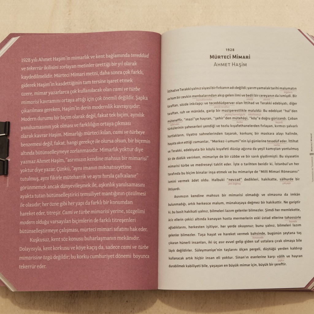 Bu yazının vesilesi Ahmet Haşim olduğu için, burada sadece O’nun derlemeye alınan yazılarını mesele edeceğim. Tereddüd ve Tekerrür‘de şairin külliyatından alınmış Güvercin dahil 8 tane ‘metin’ var. Ne kitap genelinde ne Ahmet Haşim özelinde bu ‘metin’lerin neden ve nereden seçildiğine ilişkin bir açıklama yok. Fakat Tanju’nun ‘metin’lerin kenarına iliştirdiği yorumlarına bakarak yazıların Tereddüd ve Tekerrür leitmotifi‘ne faydasını filtreleyecek bir değerlendirme süzgecinden geçtiğini sezmek mümkün. Yazıların faydasız kısımları atılarak işe yarar metinler haline getirilmiş. Üstelik yazıların yayın tarihleri de yanlış. Mesela kitapta 1928 yılında yayınlandığı belirtilen “Mürteci Mimari” yazısı, derlemenin de kaynağı olduğunu sandığım, Dergah’tan çıkan Külliyata göre 1924 yılında yayınlanmış. Bu fark kaale alınmayacak türden değil. 1924 yılında, şairin ‘Mürteci Mimari’ veya ‘Türk Mimarisi’ adını koyduğu inşa usulünden başkasını bilen mimar yoktu memlekette, 1928 yılında ise esamesini okuyacak göt yoktu kimsede. (Bkz.: Nahoş Bir Olay) . Bu fenomeni hedefe koymanın 1924’te bir ağırlığı vardı 1928’de yoktu. Mesela “Mürteci Mimari” yazısına Mimar Ali Rıza’dan bir cevap geldiğini öğreniyoruz Dergah yayınından. Ama bu cevap Tanju’nun seçkisinde yok. Daha önce yayınlandığı halde Tereddüd ve Tekerrür‘de 1928 yılına tarihlendirilmiş 3-4 yazı daha var. Bu tarih sapmaları şu ilk cümleyle yorum kürsüsüne çıkmasına yol vermiş : 1928 yılı Ahmet Haşim’in mimarlık ve kent bağlamında tereddüd ve tekerrür ikilisini zorlayan metinler ürettiği bir yıl olarak kaydedilmelidir. Kaydedilemedi, postulat yanlış.